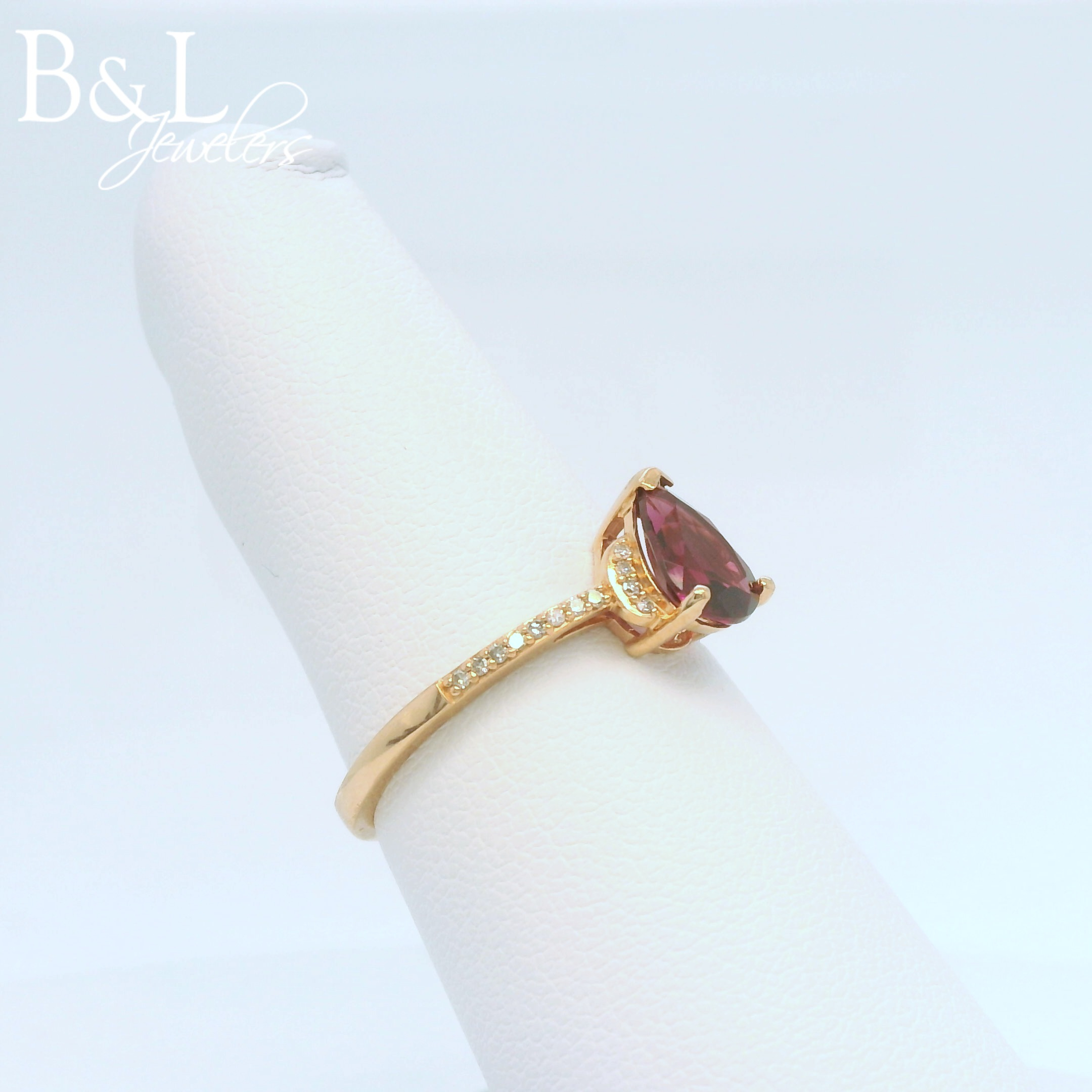 10k Rose Gold Pear Rhodalite Garnet and .10ct Diamond Fashion Ring B & L Jewelers Danville, KY